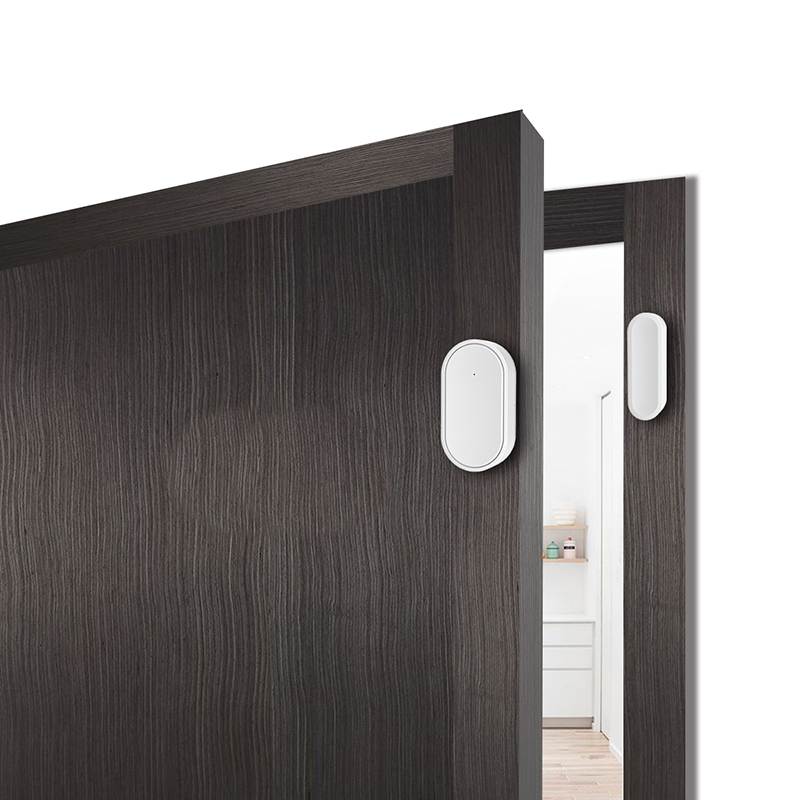 This is a compact and wireless door/window sensor designed for home security and automation. It monitors the open/close status of doors and windows and triggers an alarm and notifications via a connected hub system when unauthorized opening is detected.