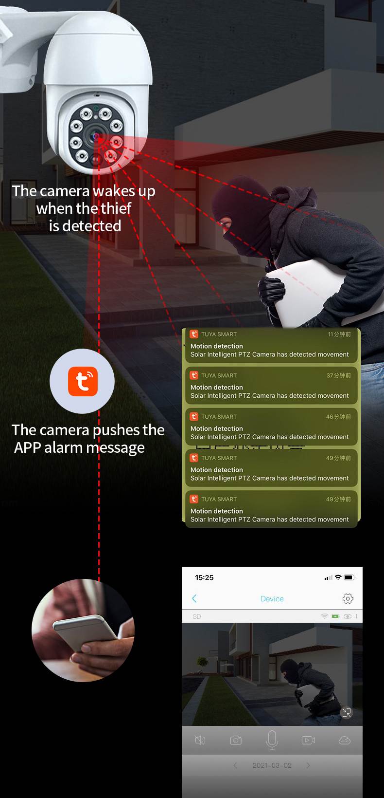 3.Humanoidanalysis:whenthemonitoring changes,thecamerawll intelligenly analyze the humanoid and push the alarm information to the user's mobile app. Within one second, the camera will start to shoot video,and at the same time,a voice warning will be issued:"you have broken into the monitoring alert area, please leave immediately!" And play sirens to drive the intruders away.( For other applications,you can customize the warning sound,such as private residential areas,fish ponds, orchards,danger warning occasions,forest fire prevention,warehouses,construction sites and other places. Please indicate the demand when placing an order, otherwise it is the default voice plus alarm sound when leaving the factory.)