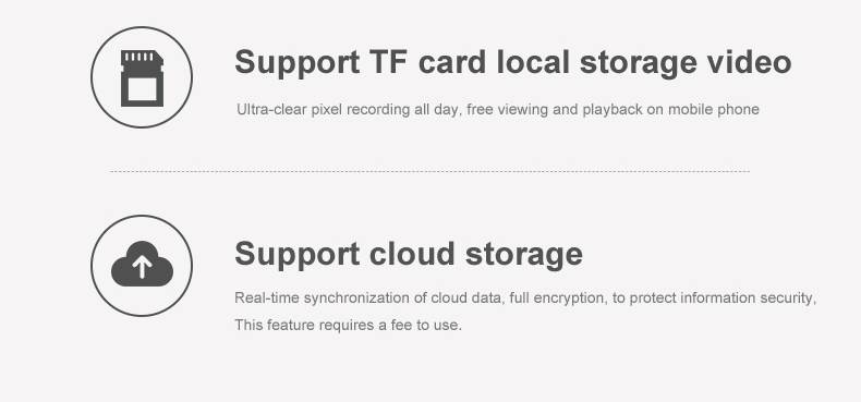 8. Video storage by TF card (Maximum support for 1024g memory card storage)or upload to cloud server (paid service).