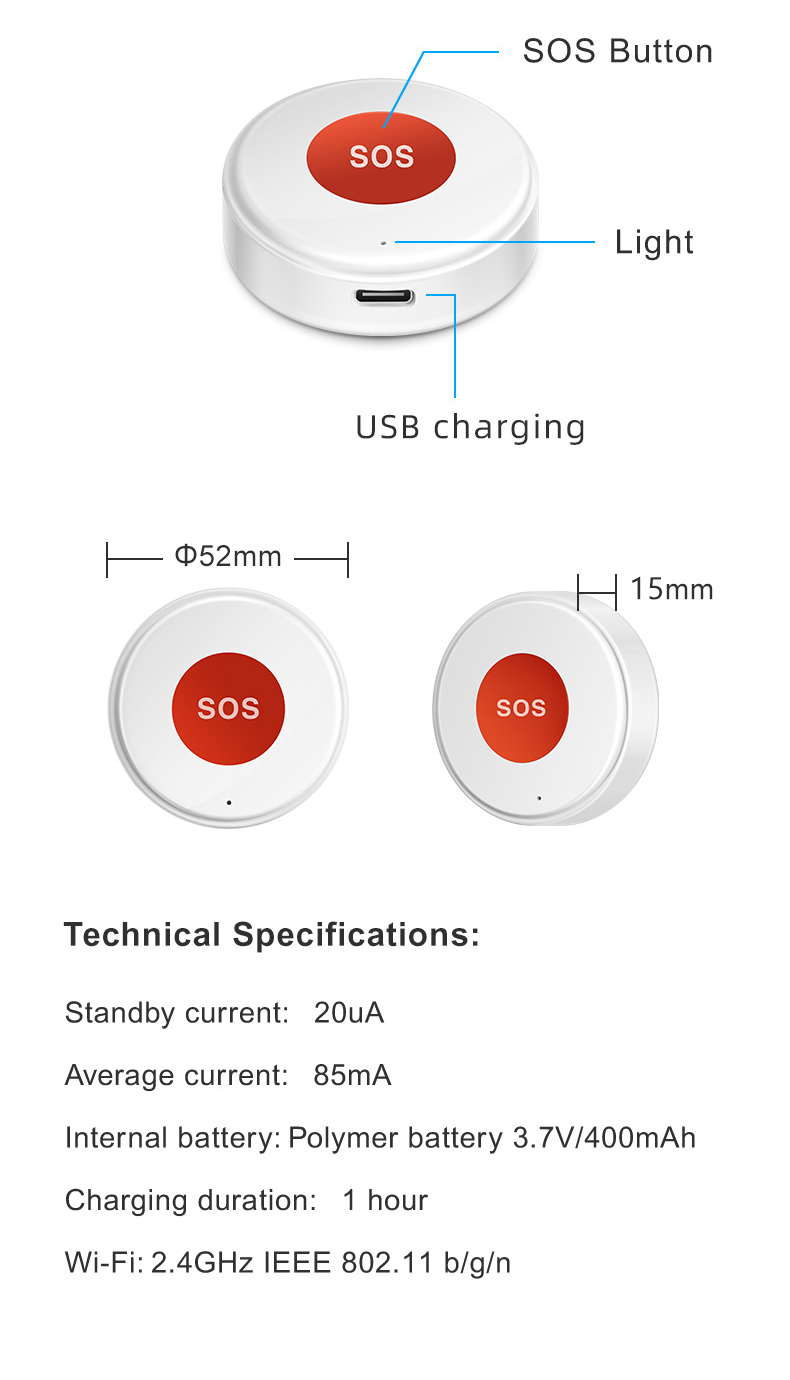 It operates on 2.4GHz IEEE 802.11 b/g/n Wi-Fi networks and requires the "Smart Life" mobile app for setup and use. The button can be installed using double-sided adhesive in locations such as bathrooms, toilets, or kitchens, or worn around the neck using the attached lanyard.