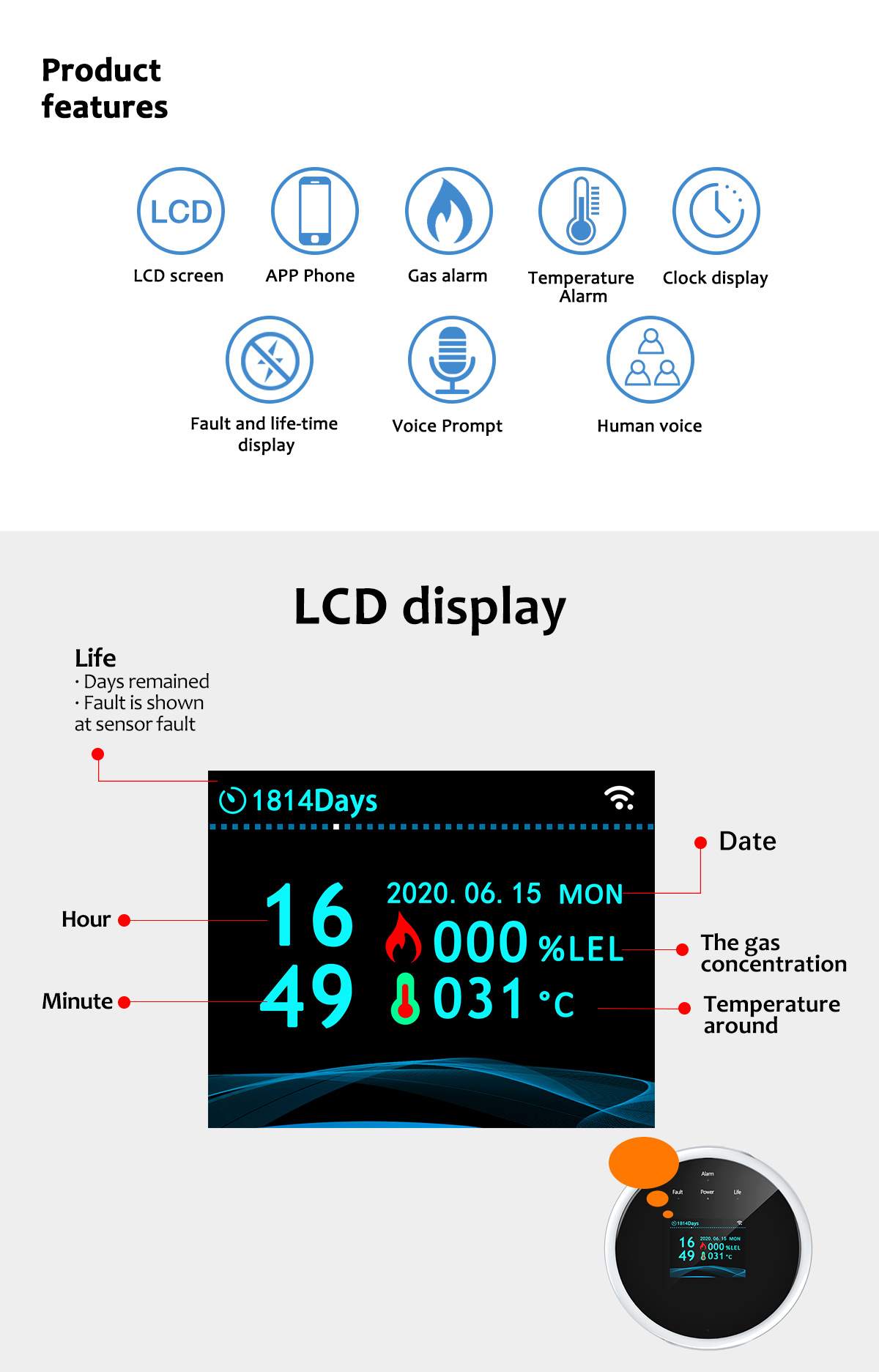 6:TFT color LCD displays: date/time, gas level, temperature, remaining life days