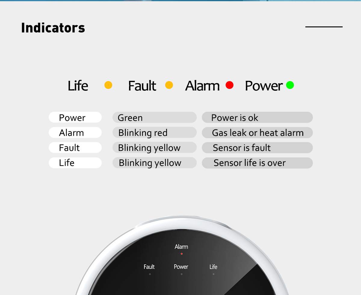 | Alarm methods | Indicator, sound, voice, APP push |