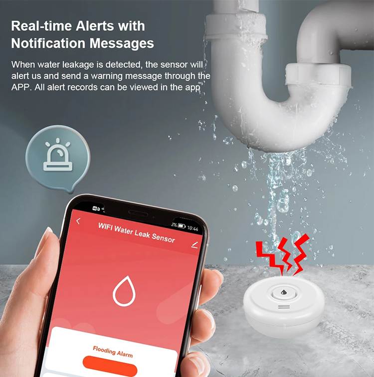 The WiFi Water Leakage Sensor is an intelligent device designed to detect water leakage in the surrounding environment. It supports 2.4GHz Wi-Fi network connection, so please ensure you have a 2.4GHz Wi-Fi signal. You can receive real time water leakage alerts on your smartphone or other smart devices.