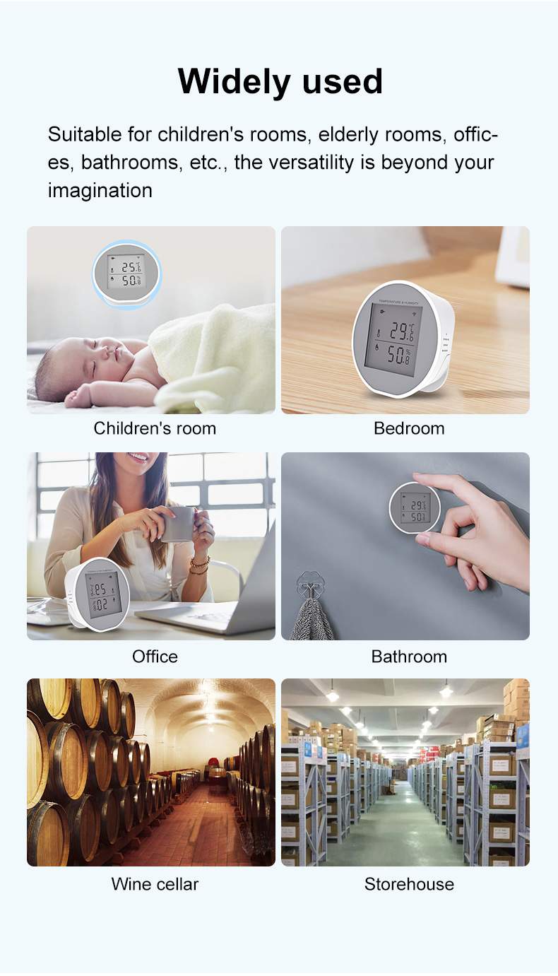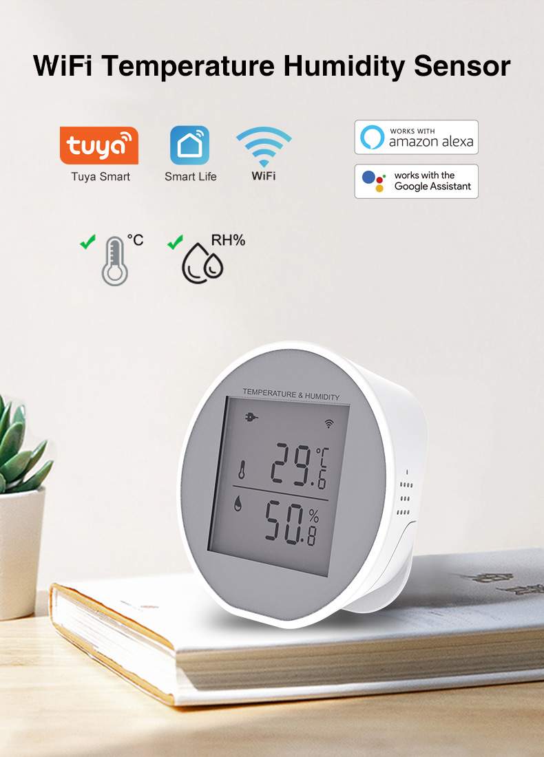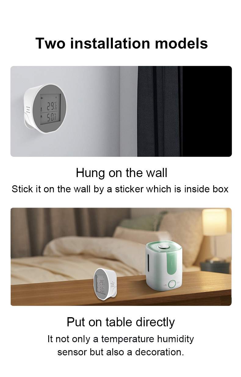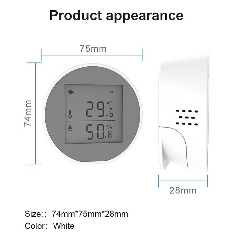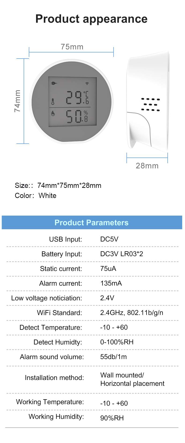 A smart wireless sensor that monitors and reports temperature and humidity levels to your smartphone via the Tuya "Smart Life" app. It supports both battery and USB power, features a built-in buzzer for alerts, and allows for customizable alarm thresholds and data logging.