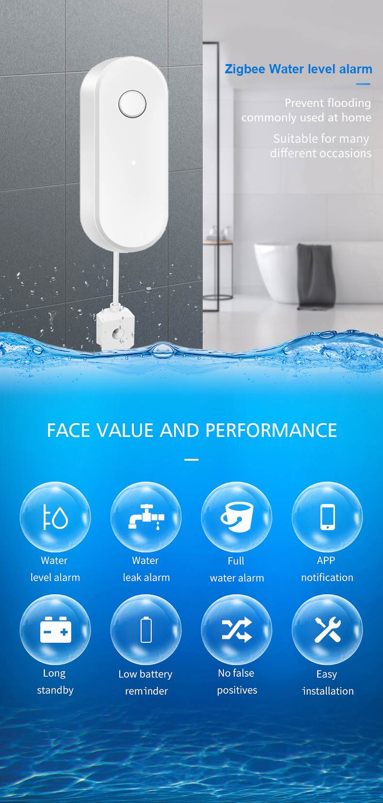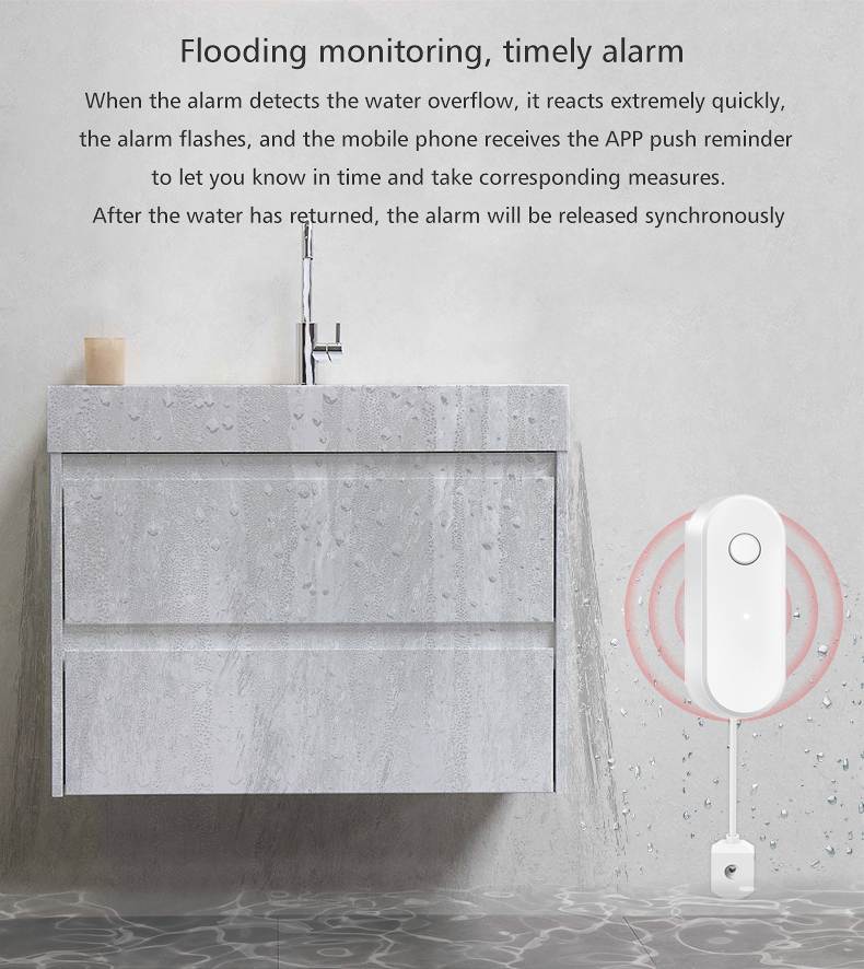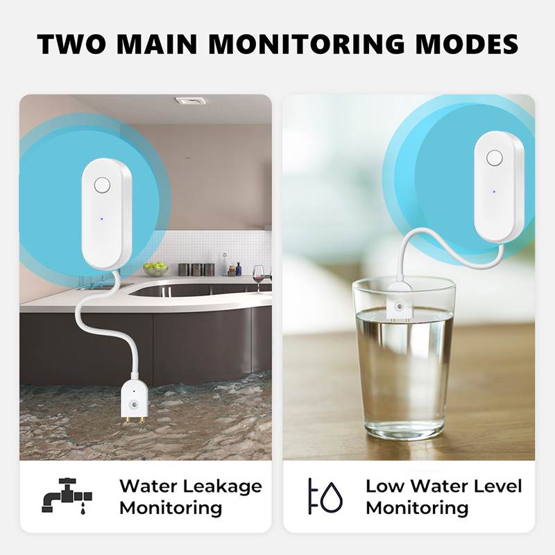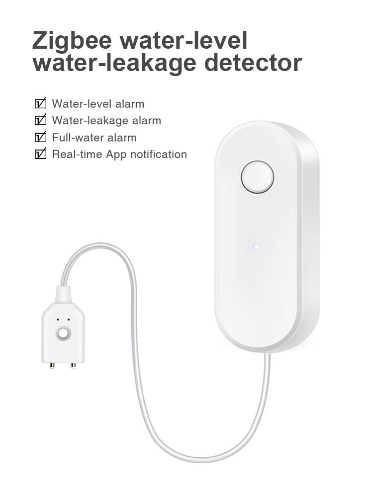 The Zigbee Water/Flood Detector is designed to monitor areas for water leakage or flooding. When water contacts the metal probes, the device triggers an immediate alert via the TuyaSmart or Smart Life app, notifying users with the message: "Detected water leakage, please check device." The corresponding icon within the app will also change to clearly indicate an active water leakage alarm.