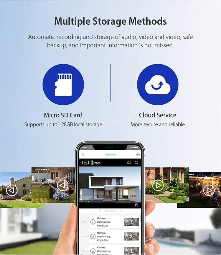 8. Video storage by TF card (Maximum support for 1024g memory card storage)or upload to cloud server (paid service).