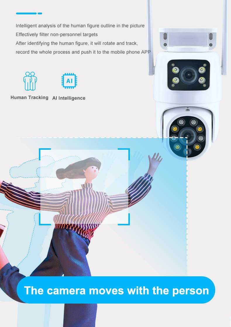 4.Intelligent tracking: when someone intrudes in the survellance area,the camera horn will give a voice warning and carry out inteligent tracking according to the movement track of the people on the scene. The camera will automatically follow where the people go,so that the intruder has no place to hide.