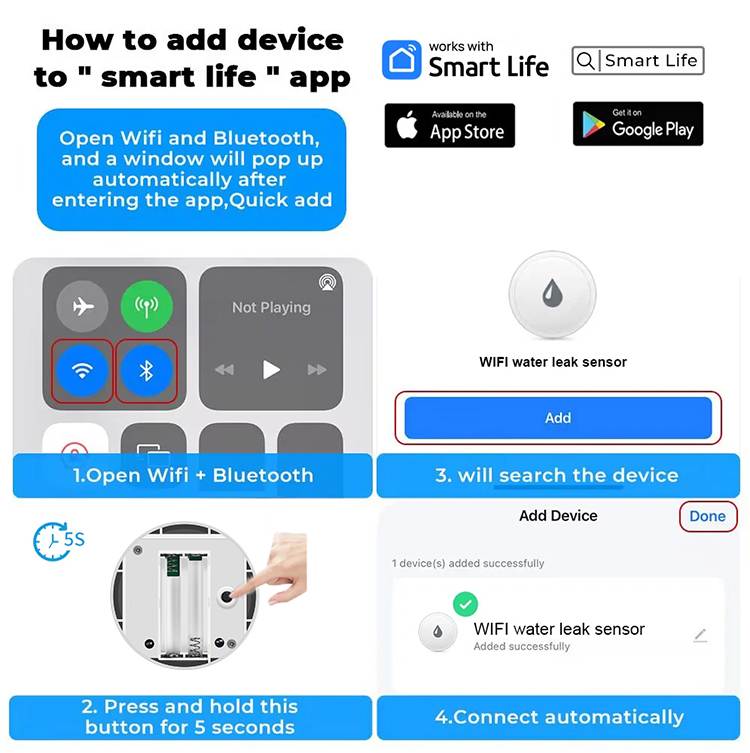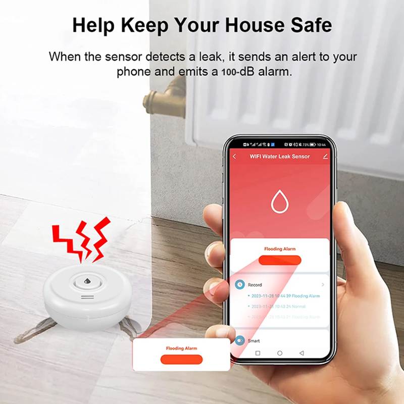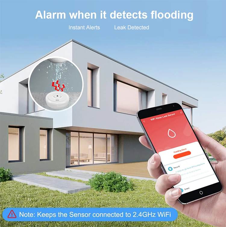The WiFi Water Leakage Sensor is an intelligent device designed to detect water leakage in the surrounding environment. It supports 2.4GHz Wi-Fi network connection, so please ensure you have a 2.4GHz Wi-Fi signal. You can receive real time water leakage alerts on your smartphone or other smart devices.