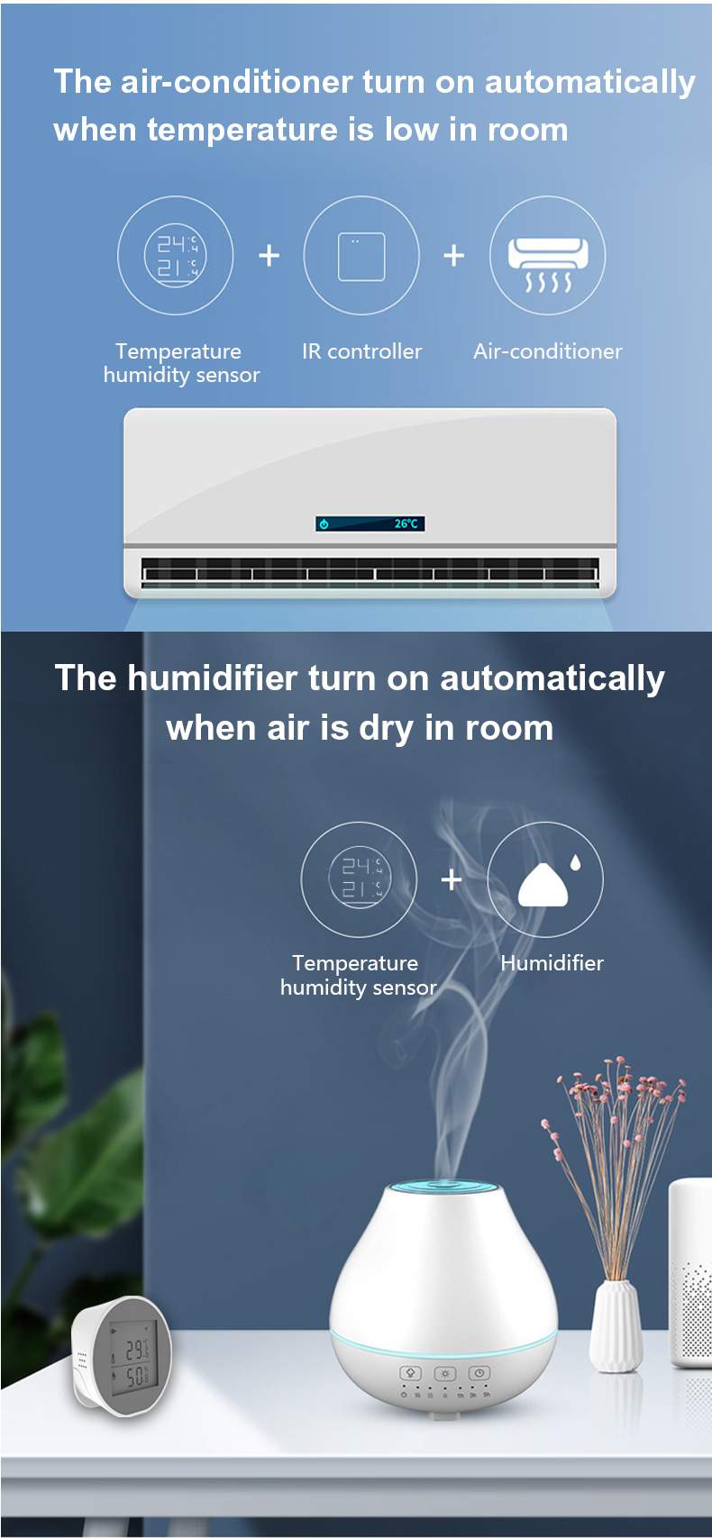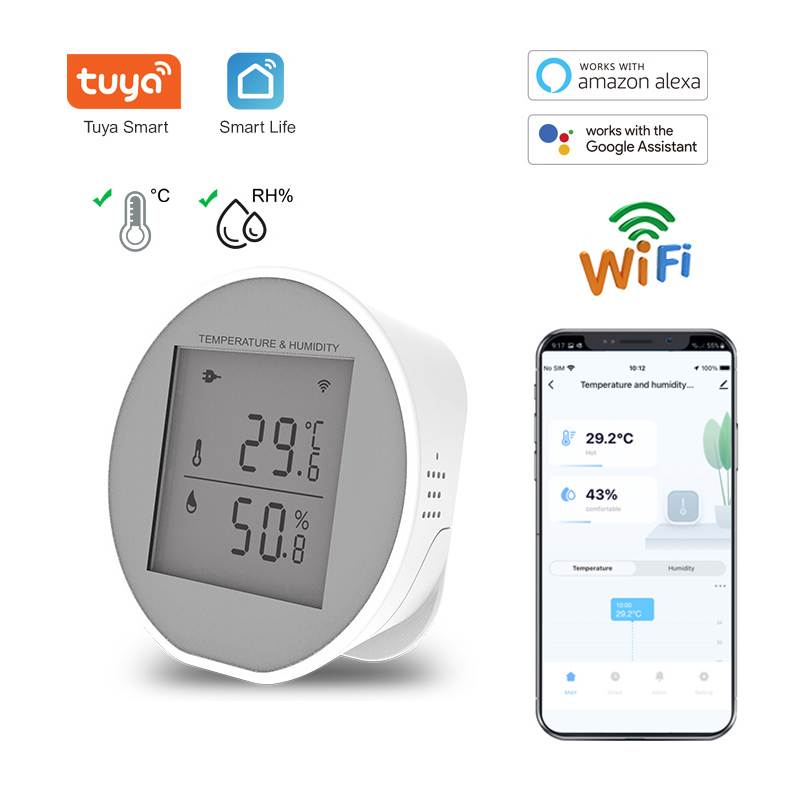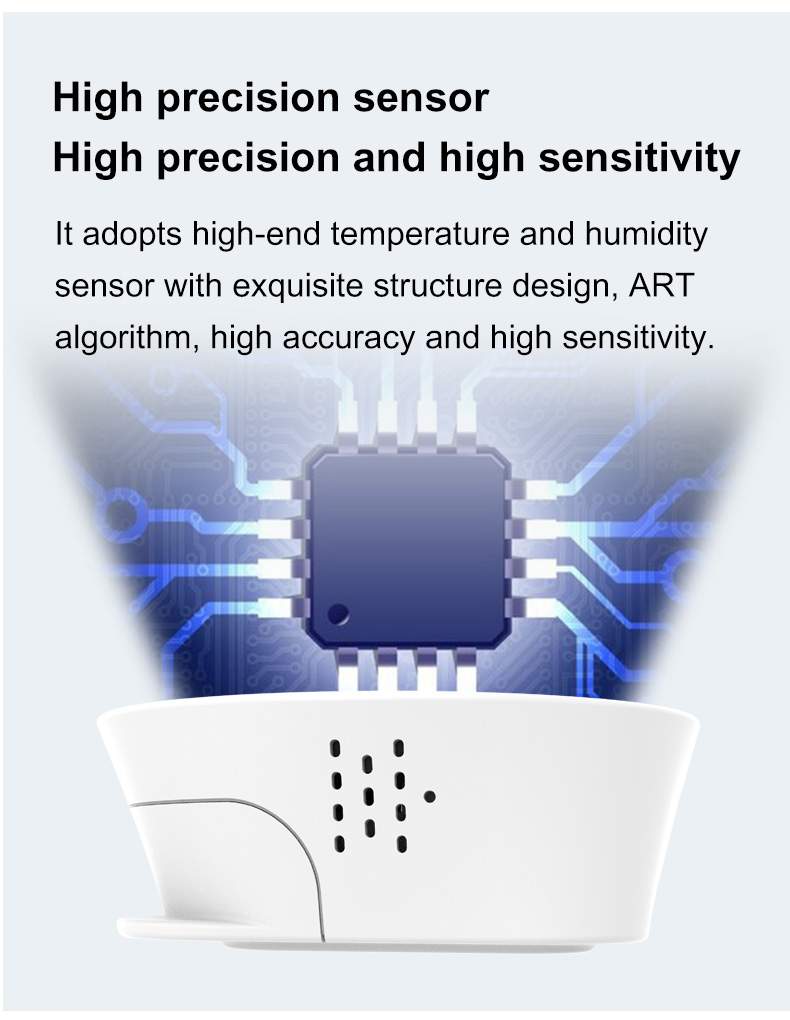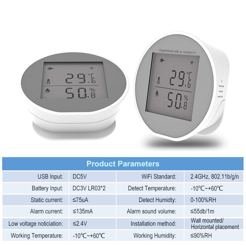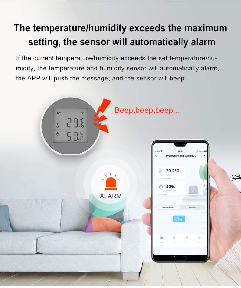A smart wireless sensor that monitors and reports temperature and humidity levels to your smartphone via the Tuya "Smart Life" app. It supports both battery and USB power, features a built-in buzzer for alerts, and allows for customizable alarm thresholds and data logging.