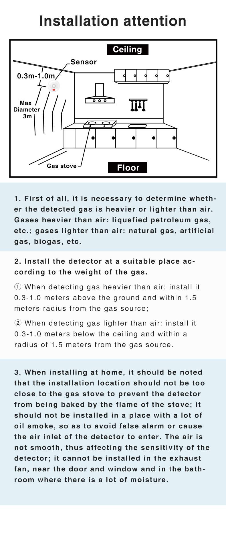 The Zigbee Combustible Gas Detector is designed to continuously monitor indoor environments—such as kitchens—for leaks of flammable gases, including natural gas, LPG, manufactured gas, and marsh gas. Equipped with a high-stability semiconductor gas sensor, the detector activates an immediate alarm once gas concentrations reach the preset threshold (e.g., 7% LEL ±3% LEL for methane/CH₄). The alarm provides both audible alerts at 70dB (measured from 1 meter) and clear visual warnings to help prevent potential hazards.