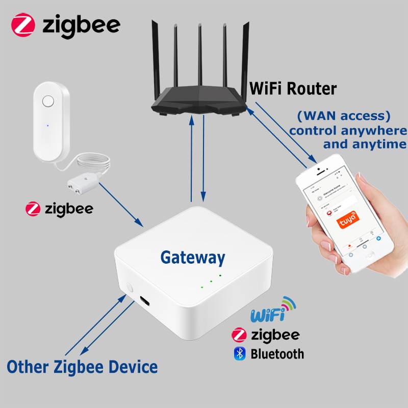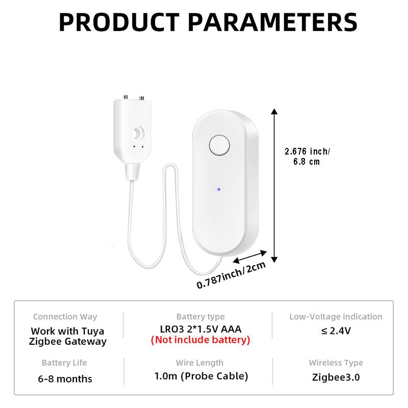 The Zigbee Water/Flood Detector is designed to monitor areas for water leakage or flooding. When water contacts the metal probes, the device triggers an immediate alert via the TuyaSmart or Smart Life app, notifying users with the message: "Detected water leakage, please check device." The corresponding icon within the app will also change to clearly indicate an active water leakage alarm.